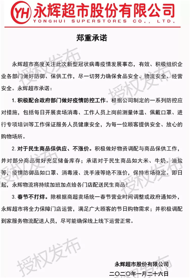 1月26日,永辉超市做出郑重承诺,尽一切努力确保食品安全、物流安全、经营安全。积极配合政府部门做好疫情防控工作,每日开展卖场消毒、工作人员上岗前测量体温、佩戴口罩等安全措施,为市民提供安全、放心的购物场所。