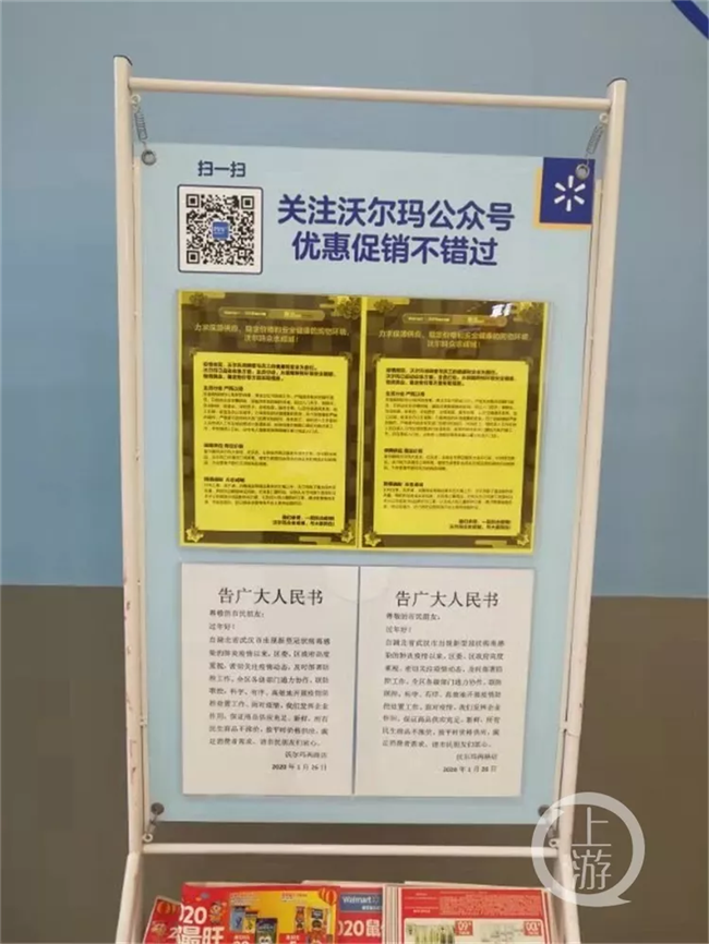26日,沃尔玛超市也张贴出了告广大人民书,承诺保证民生商品供应充足、新鲜、所有民生商品不涨价,按平时价格销售,满足消费者需求,请市民朋友们放心。