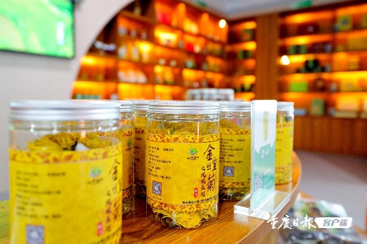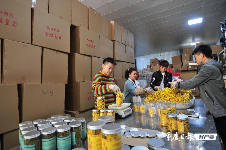▲隘口镇农村电商集配中心创业青年在打包金丝黄菊