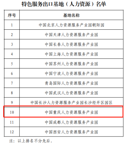 3月22日,商务部、人力资源社会保障部等7部门联合公告2022年第9号专业类特色服务出口基地名单。经过项目申报、第三方机构客观指标评价、答辩评审、商务部和人力资源社会保障部综合评议等一系列程序,中国重庆人力资源服务产业园获批特色服务出口基地(人力资源),这也是继国家中医药服务出口基地后,重庆市第二个获批的国家特色服务出口基地。