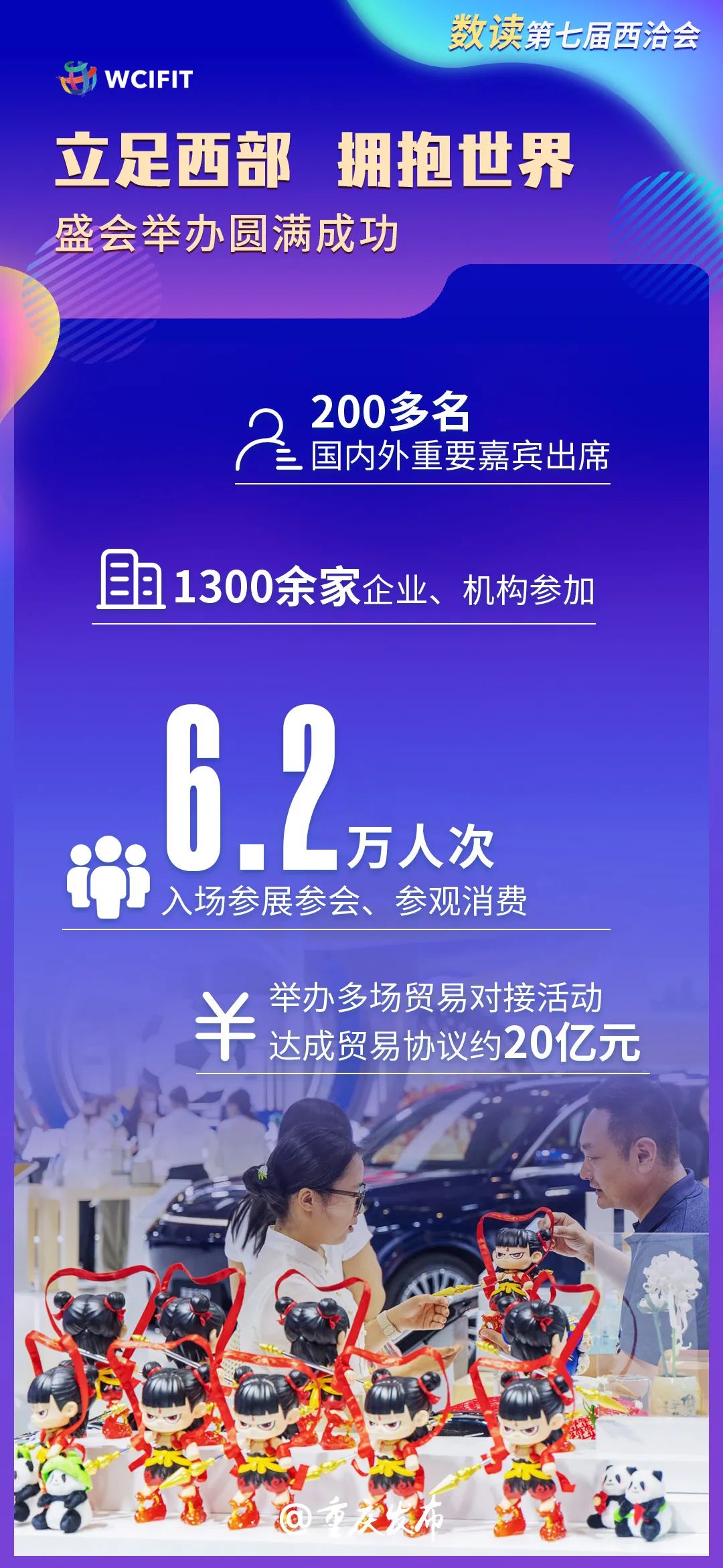 贸易合作再创新高,本届西洽会期间举办多场贸易对接活动,达成贸易协议约20亿元。展览展示效果突出,充分展现了西部地区高质量发展和对外开放成果,西部对接世界、世界了解西部、西部与世界合作的“窗口”作用进一步发挥。