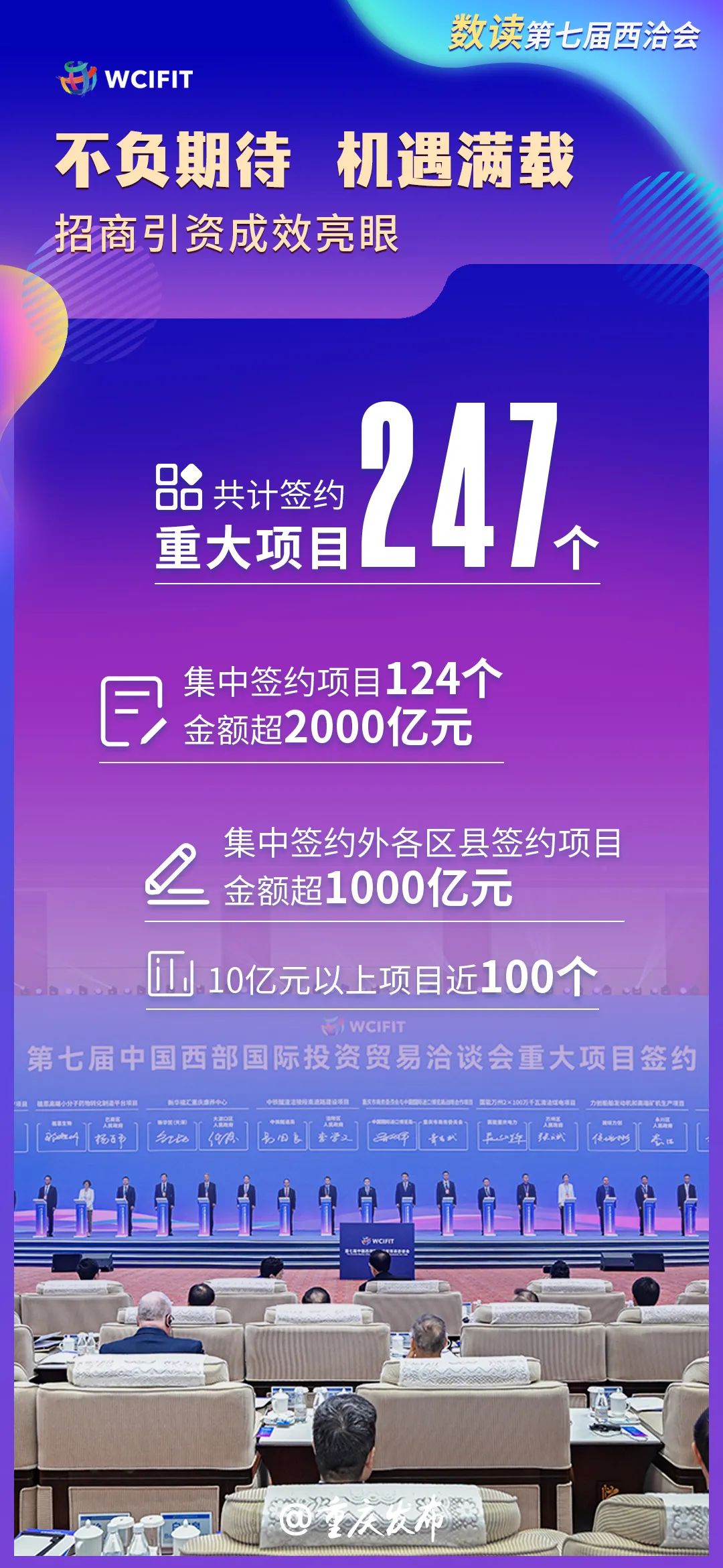 章勇武说,招商引资一直是西洽会的重头戏。本届西洽会上,成功举办跨国公司重庆行、“投资西部行”重点产业路演对接等活动,共计签约重大项目247个,其中集中签约项目124个、金额超2000亿元,集中签约外各区县签约项目金额超1000亿元,一批引领性强、带动性大的项目落地,为新时代西部大开发形成新格局注入强大动能。