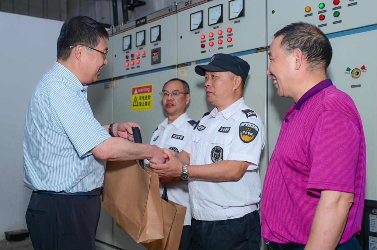 章勇武主任慰问了消防值班人员、设备保养检修人员、车场管理人员等基层一线员工代表,赠送了防暑降温生活用品和必备药品,代表市商务委委党组向他们的辛勤付出表示慰问。