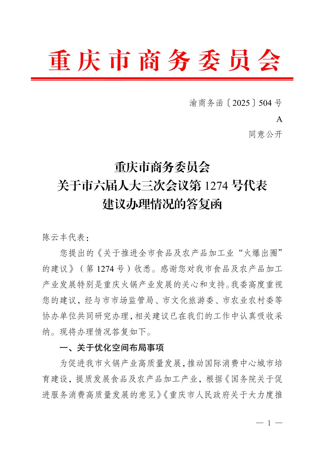 重庆市商务委员会关于市六届人大三次会议第 1274 号代表建议办理情况的答复函