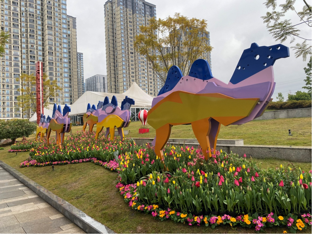交易中心旁的丝路花街,也全面融入“一带一路”文化元素,设计有异域风情特色的创意艺术装置、“一带一路”沿线国家特色的景观小品等,极具观赏性。