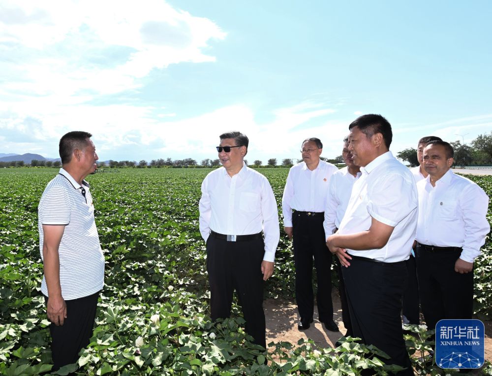 7月12日至15日,中共中央总书记、国家主席、中央军委主席习近平在新疆考察。这是13日下午,习近平在新疆生产建设兵团八师一四三团农一连棉花种植基地考察。新华社记者 谢环驰 摄