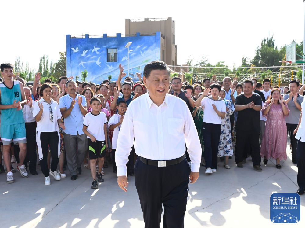 7月12日至15日,中共中央总书记、国家主席、中央军委主席习近平在新疆考察。这是14日,习近平在吐鲁番市高昌区亚尔镇新城片区新城西门村村广场,同村民们亲切交流。新华社记者 李学仁 摄