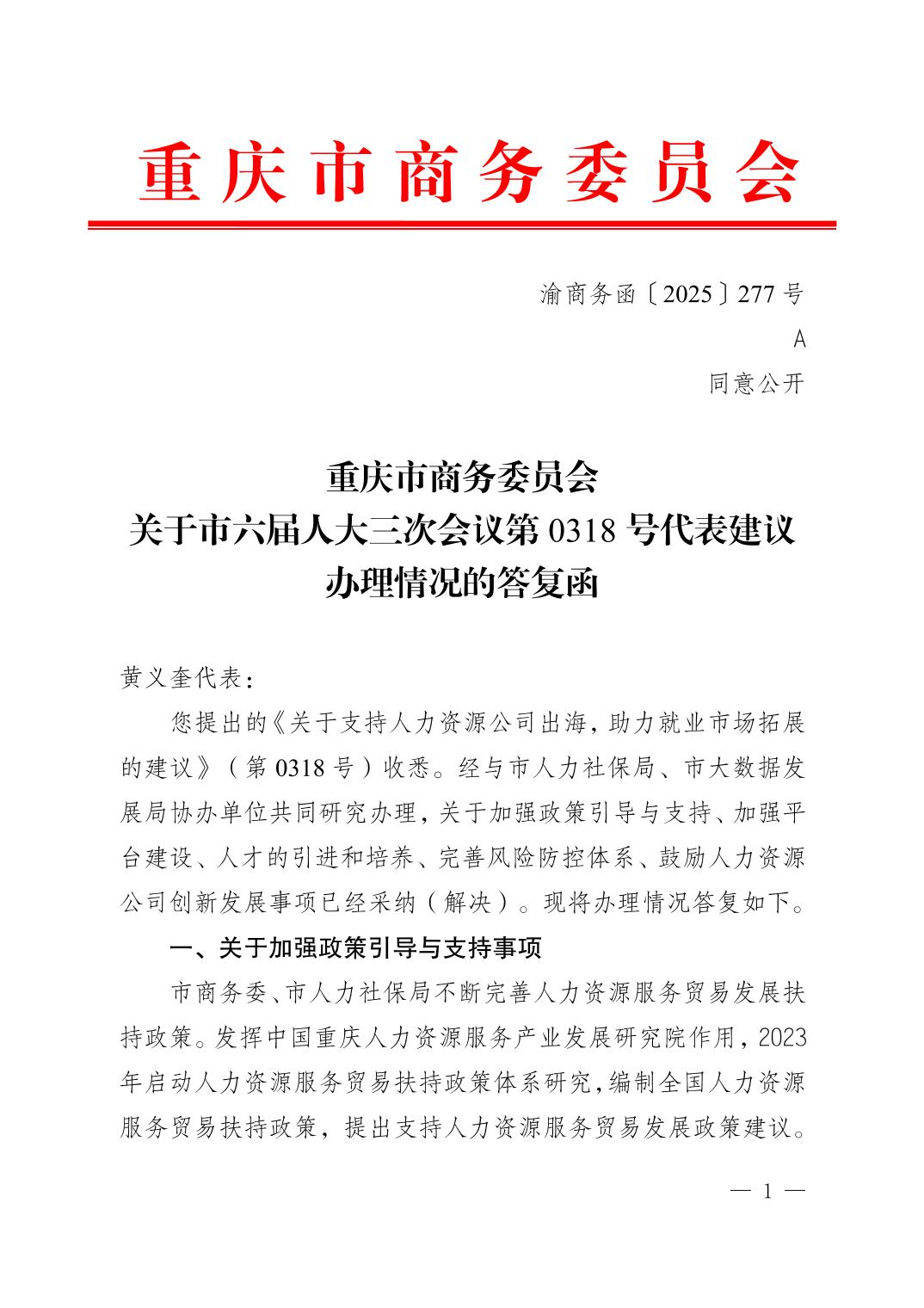 重庆市商务委员会关于市六届人大三次会议第0318号代表建议办理情况的答复函