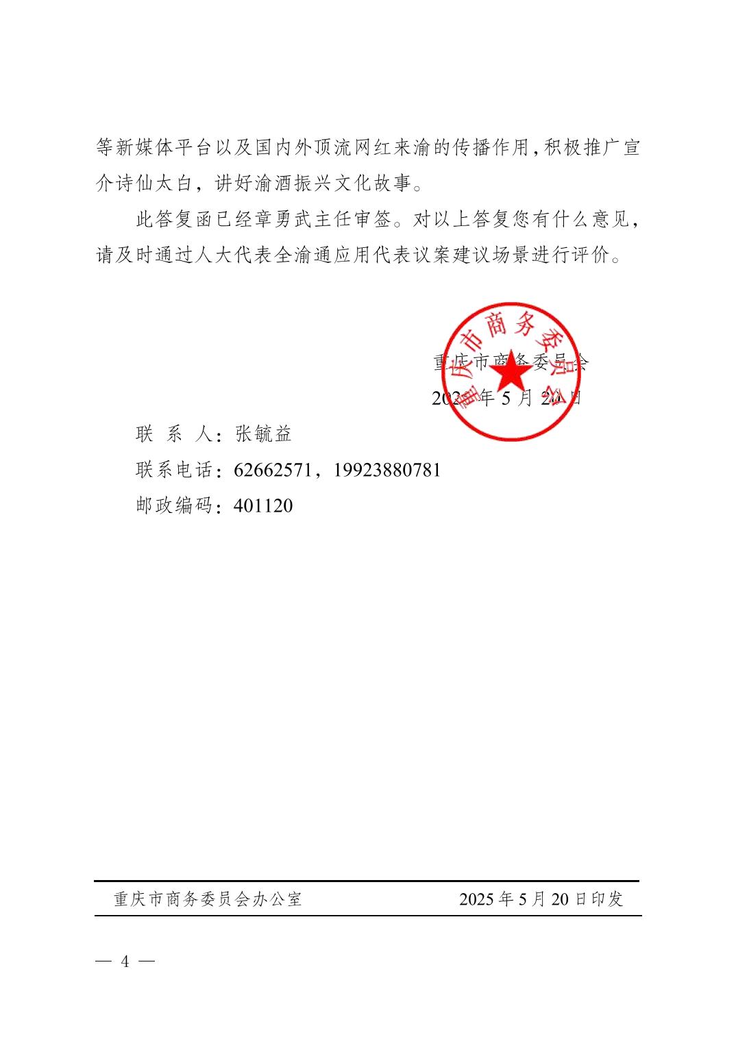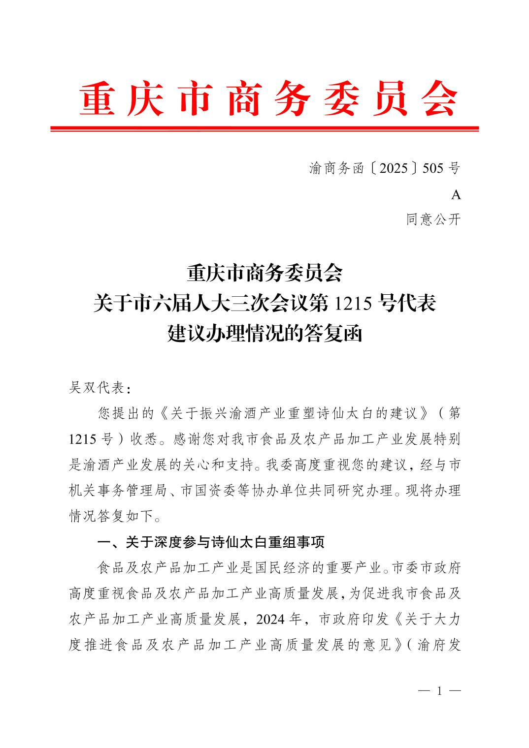 重庆市商务委员会关于市六届人大三次会议第 1215 号代表建议办理情况的答复函