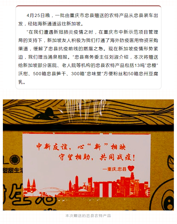 “2月7日与新加坡方面签订采购协议,8天后首批进口防疫物资就通过新加坡至广州空运、广州至忠县公路运输的方式抵达忠县,有效缓解了忠县医疗防护物资的需求。”刘淑回忆说,“当我们了解到新加坡疫情告急,第一紧缺物资是食品时,县委、县政府高度重视,并号召开展爱心赠送,报答前段时间新加坡为忠县抗击疫情工作提供的鼎力支持,同时也让新加坡消费者了解忠县的优质农特产品。得到这个消息后,企业踊跃报名,纷纷要求奉献一份忠县爱心。最终,忠县3家出口企业联手本地11家农特产品企业紧急组织了货源,希望能用小小爱心温暖国际友人。”