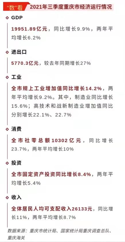 10月20日,重庆市2021年三季度经济运行情况发布。前三季度,全市GDP达到19951.89亿元,同比增长9.9%,两年平均增长6.2%(以2019年相应同期数为基数,采用几何平均的方法计算的增速,下同)。