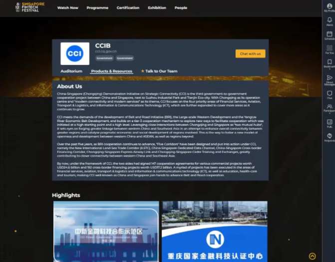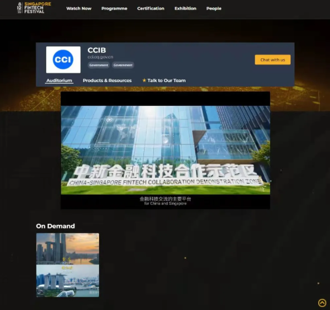 11月8日,市中新项目管理局电子展馆同新加坡金融科技节开幕式同步上线,中新金融科技合作示范区首次面向全球亮相。此次电子展馆首次对外展示了中新金融科技合作示范区宣传片和电子宣传册,充分利用新加坡金融科技节的参与者来源广泛的优势,向全球金融科技界人士宣介了示范区发展的背景、历程、方向和愿景,吸引全球优质金融科技企业的关注,助力国内外金融科技资源向重庆集聚。同时,市中新项目管理还联合国家金融科技认证中心等机构和企业,充分利用展馆资源,对国家金融科技认证中心及有关企业进行了宣介,促进重庆与世界金融科技发展接轨。
