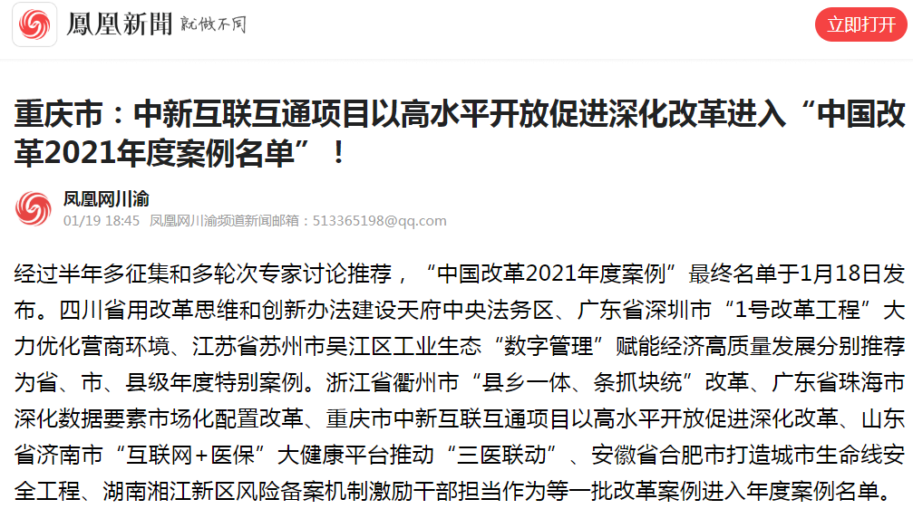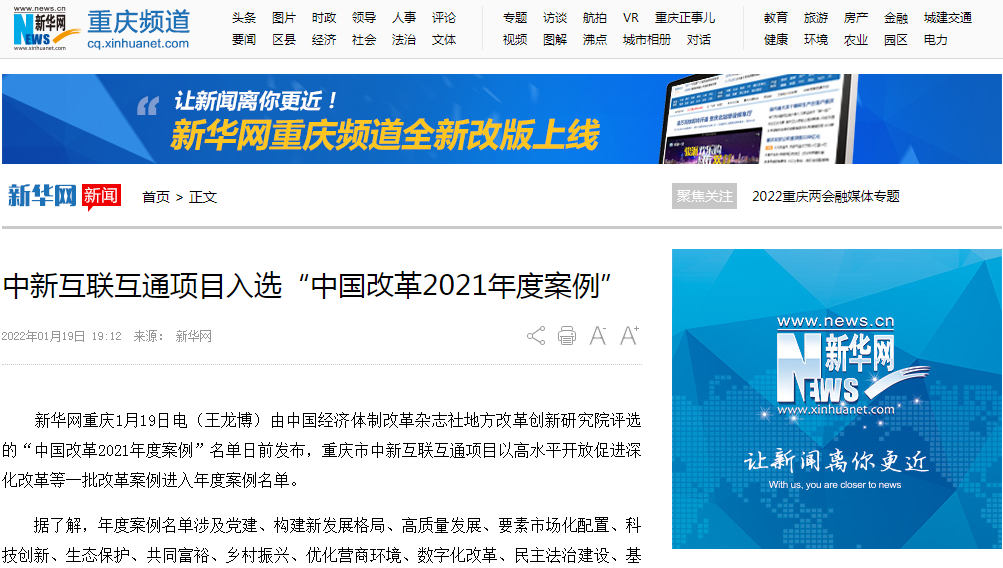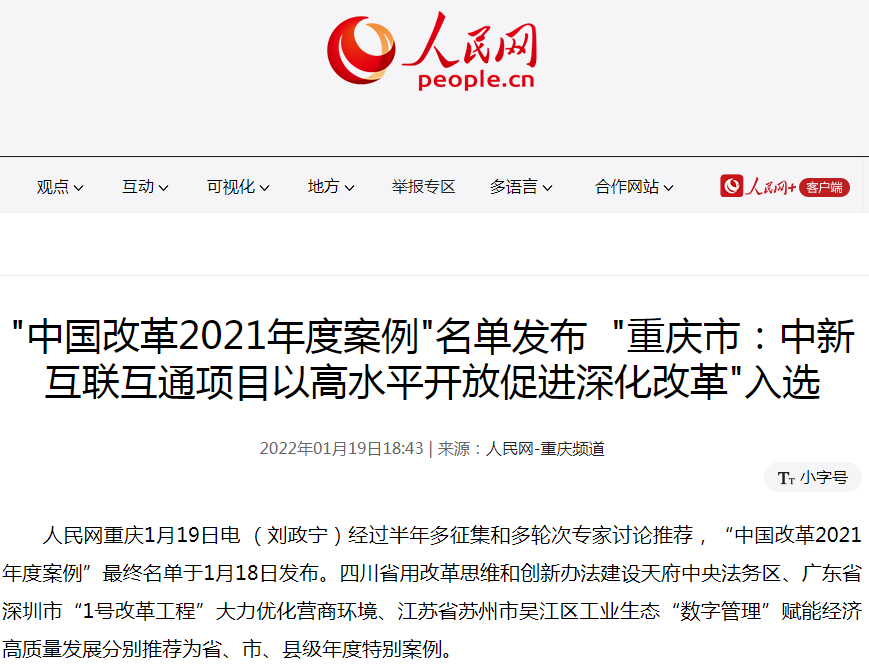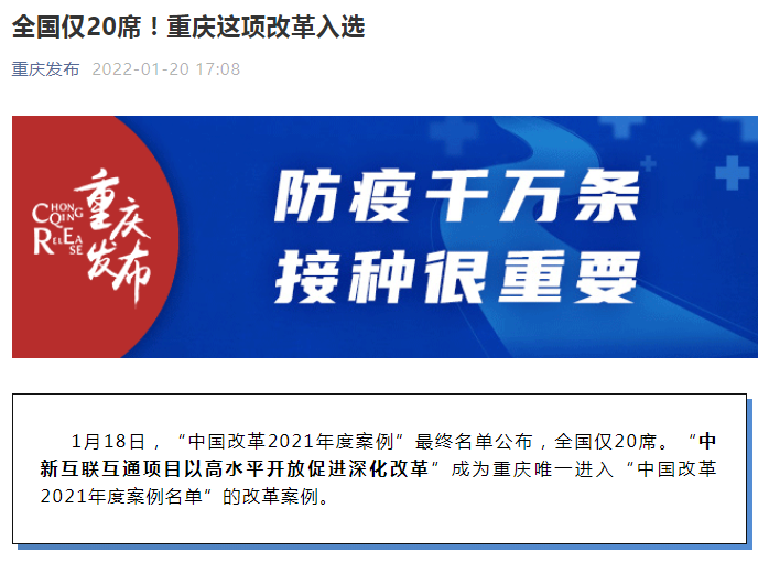 此前,经过网友票选,中新互联互通项目还以“深化产业领域改革创新 中新互联互通项目打造‘一带一路’国际合作新名片”入选2021年重庆市“我最喜欢的10项改革”。