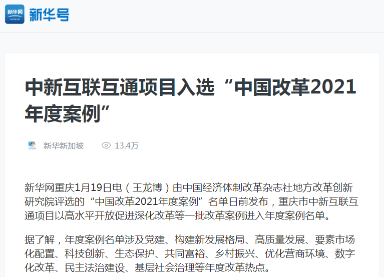 中新互联互通项目以高水平开放促进深化改革入选“中国改革2021年度案例名单”,引起海内外媒体广泛关注,一起来看。
