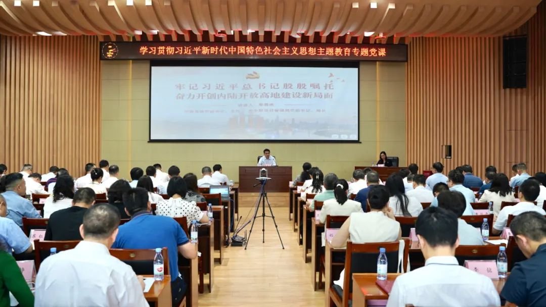 专题党课以现场授课和视频直播的方式举行。市委主题教育第九巡回指导组组长吴秋鸿、副组长薛文宬出席,市商务委及市中新项目管理局在家领导班子成员、二级巡视员出席,市商务委直属事业单位主要负责人、市中新项目管理局处级领导干部、市商务委机关副处级以上领导干部在现场参会。市商务委、市中新项目管理局及市商务委直属事业单位的其他同志通过视频直播的方式参会。
